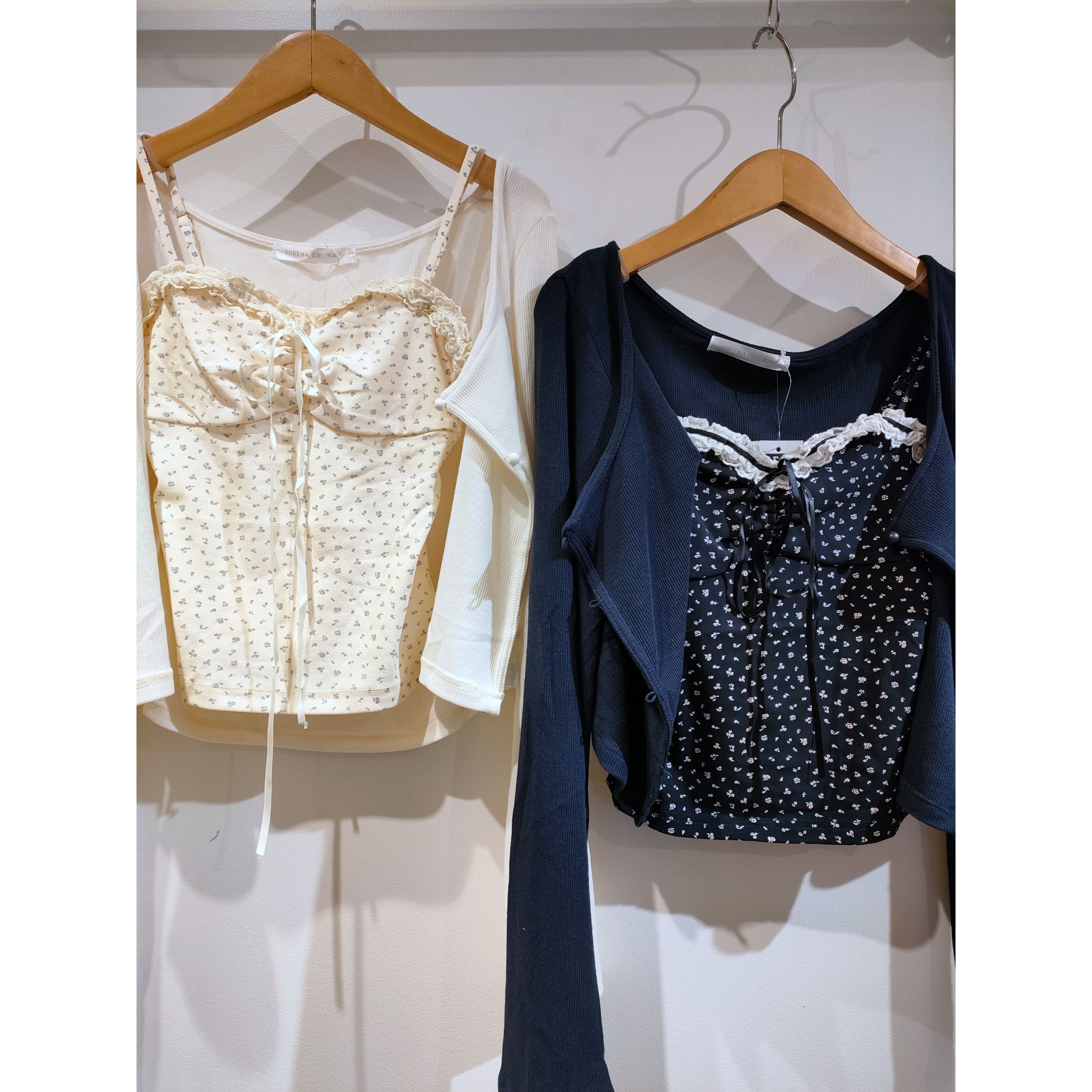 25404(2色)カーディガン付小花柄フリルキャミソール