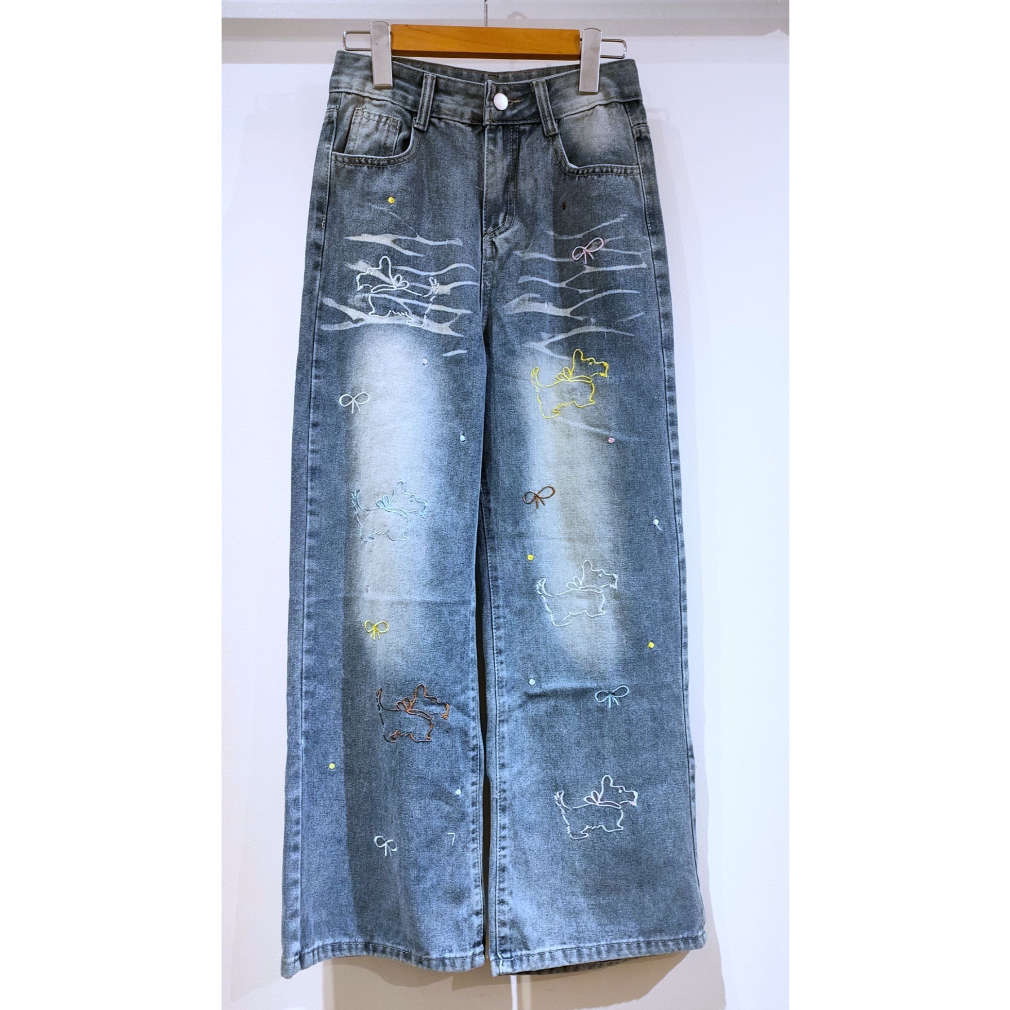 26039(1色)イヌ&リボン刺繍デニムパンツ