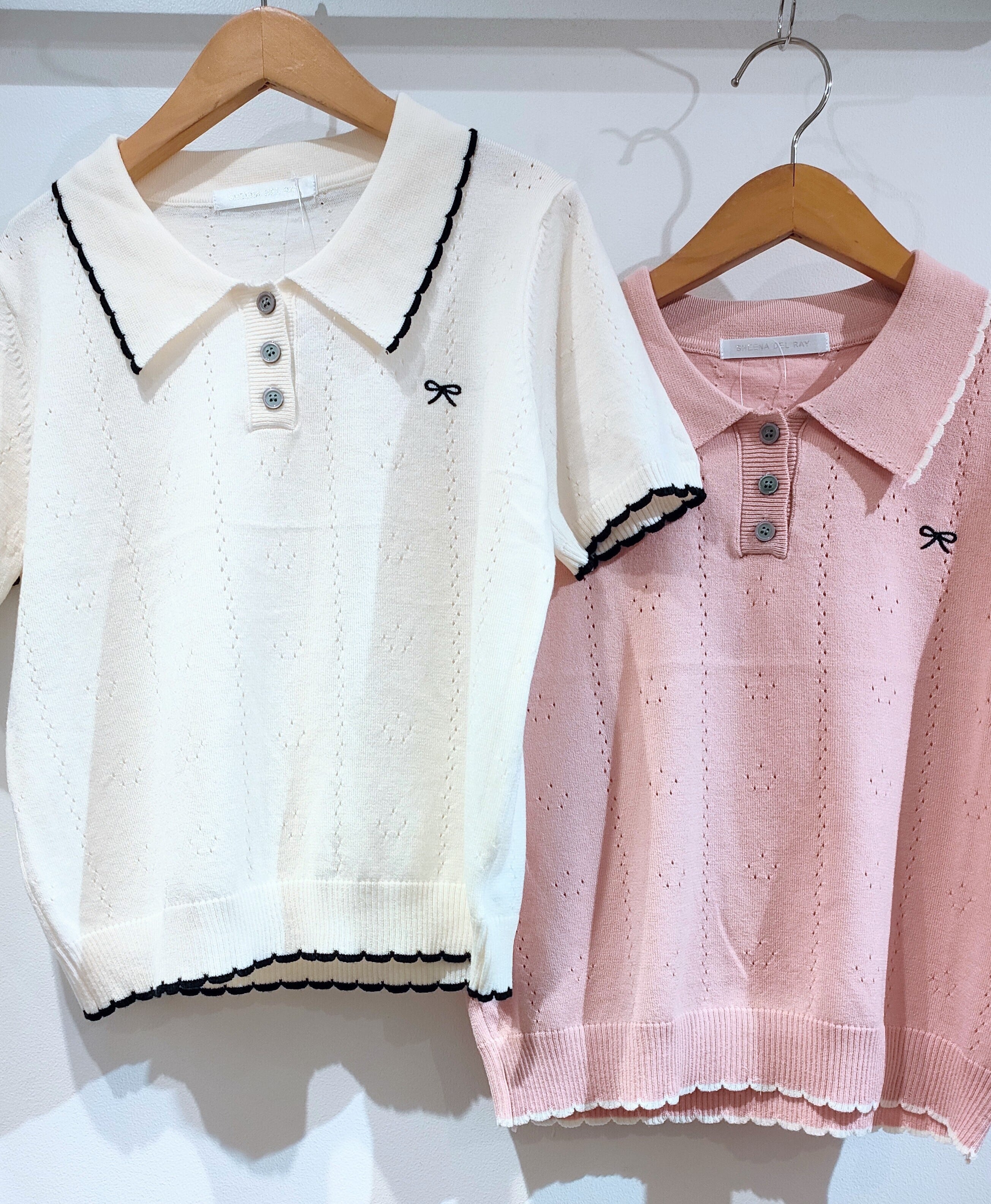 26129(4色)透け編みリボン刺繍ポロシャツ