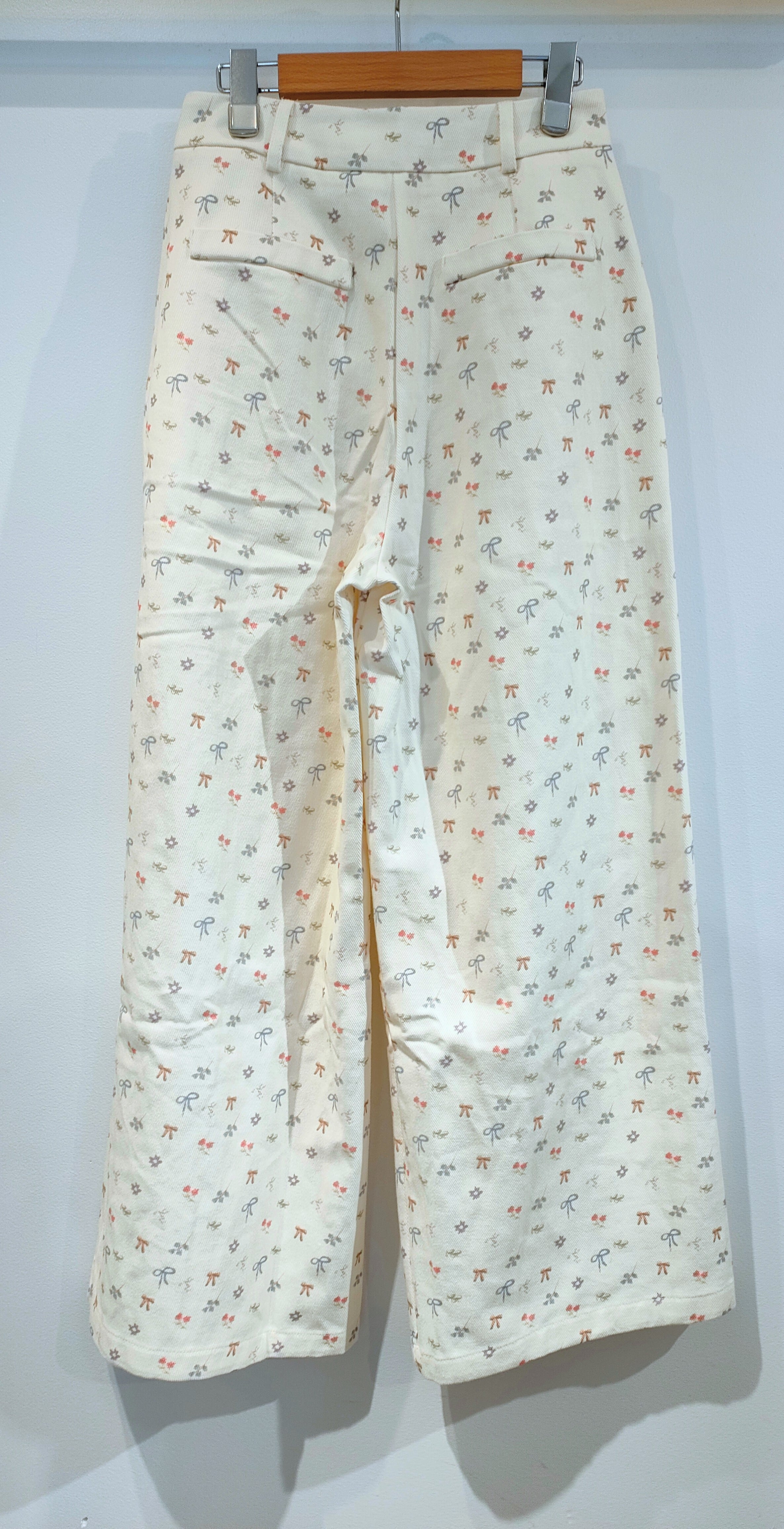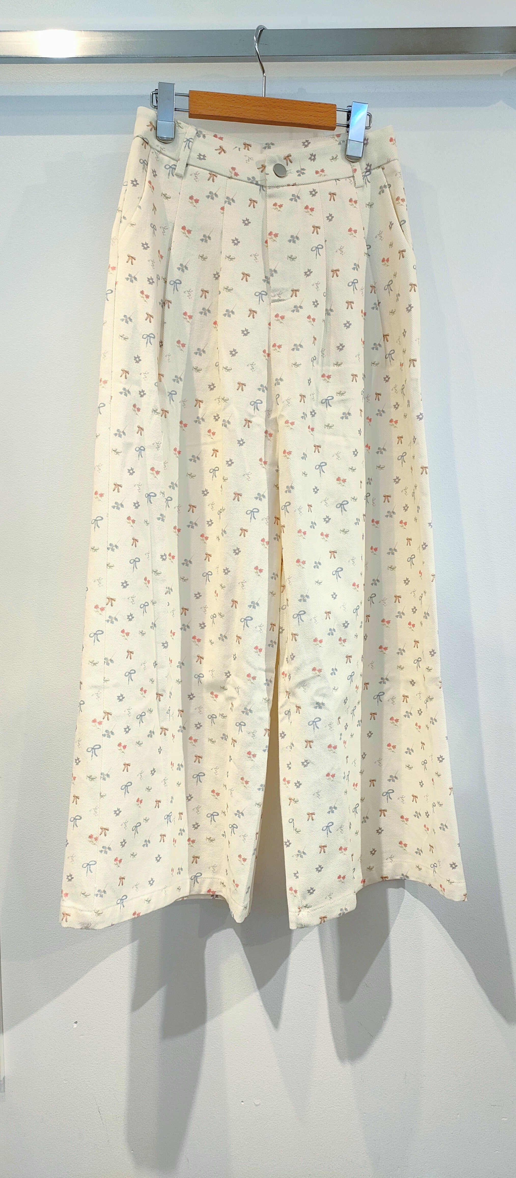 26226(ベージュ)花リボンプリントワイドデニムパンツ